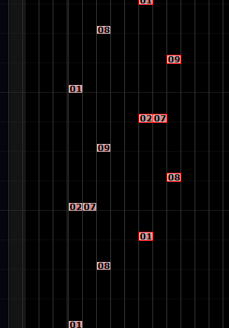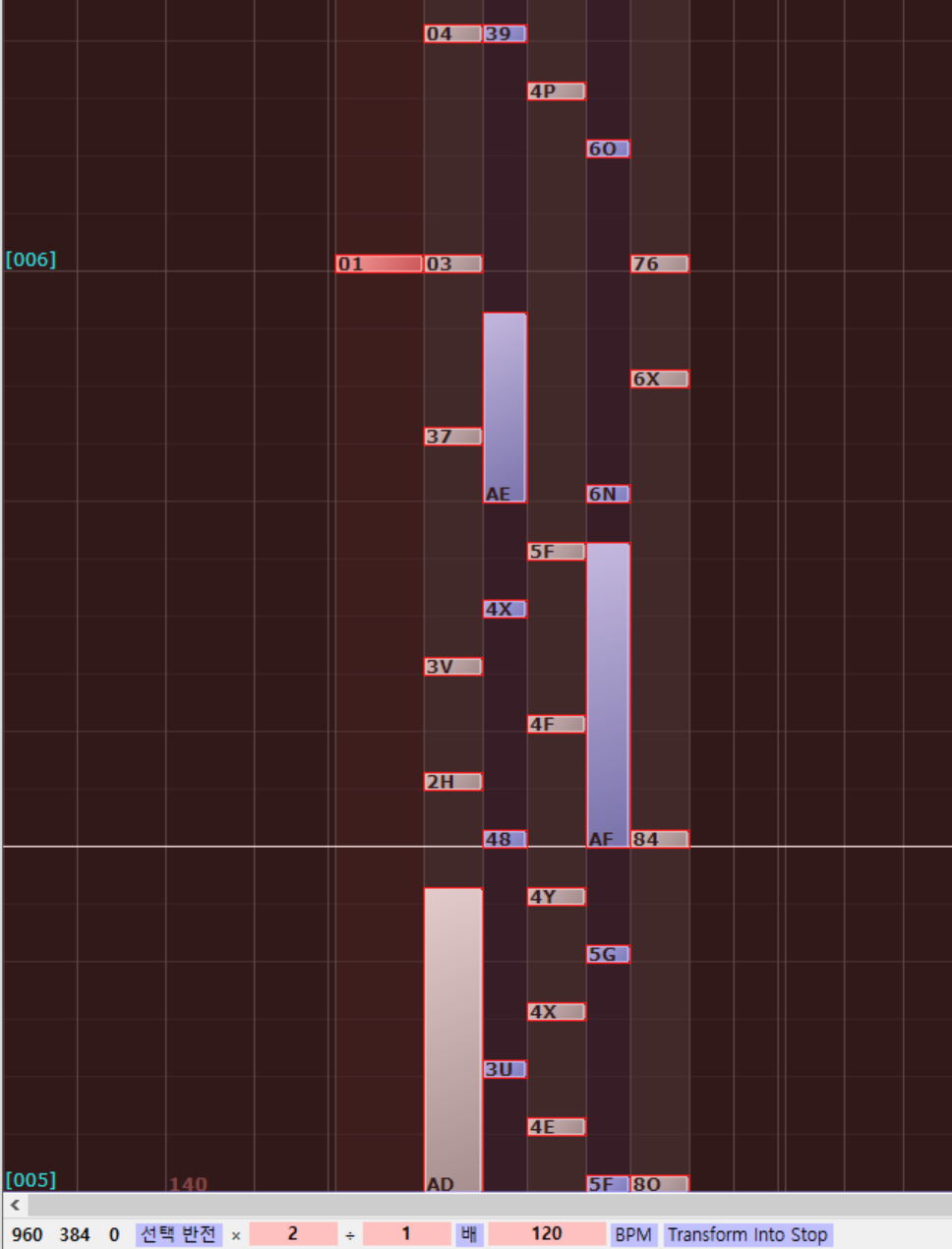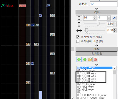 - Ctrl+Shift+노트 왼클릭: 해당 번호의 배치된 키음을 한 번에 일괄 선택한다. (ex: 01 번호에 배치된 kick.wav 파일의 노트)
