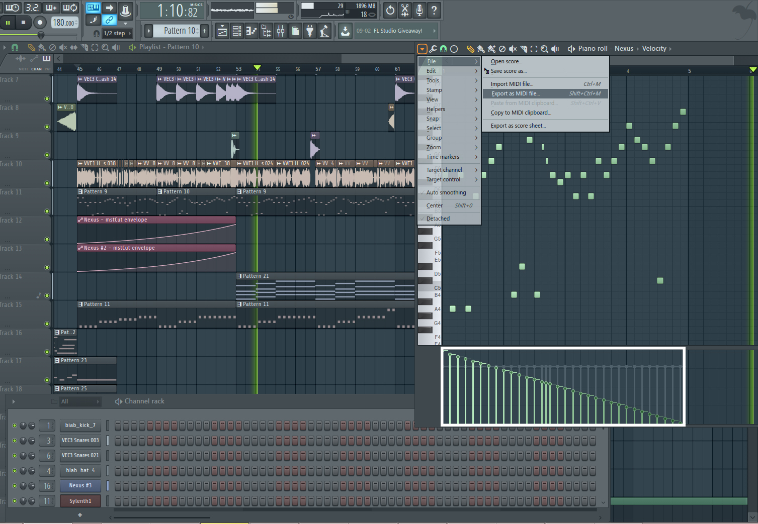 그리고 재정렬한 미디를 시퀀서에 다시 박아준 뒤, 벌어진 넓이만큼 오토메이션을 먹여준다. 그리고 아까 건드렸던 벨로시티를 다시 원래대로 돌려놓는다. 그리고 뽑는다. 나머지는 아까와 같이 하면 된다. 끝.