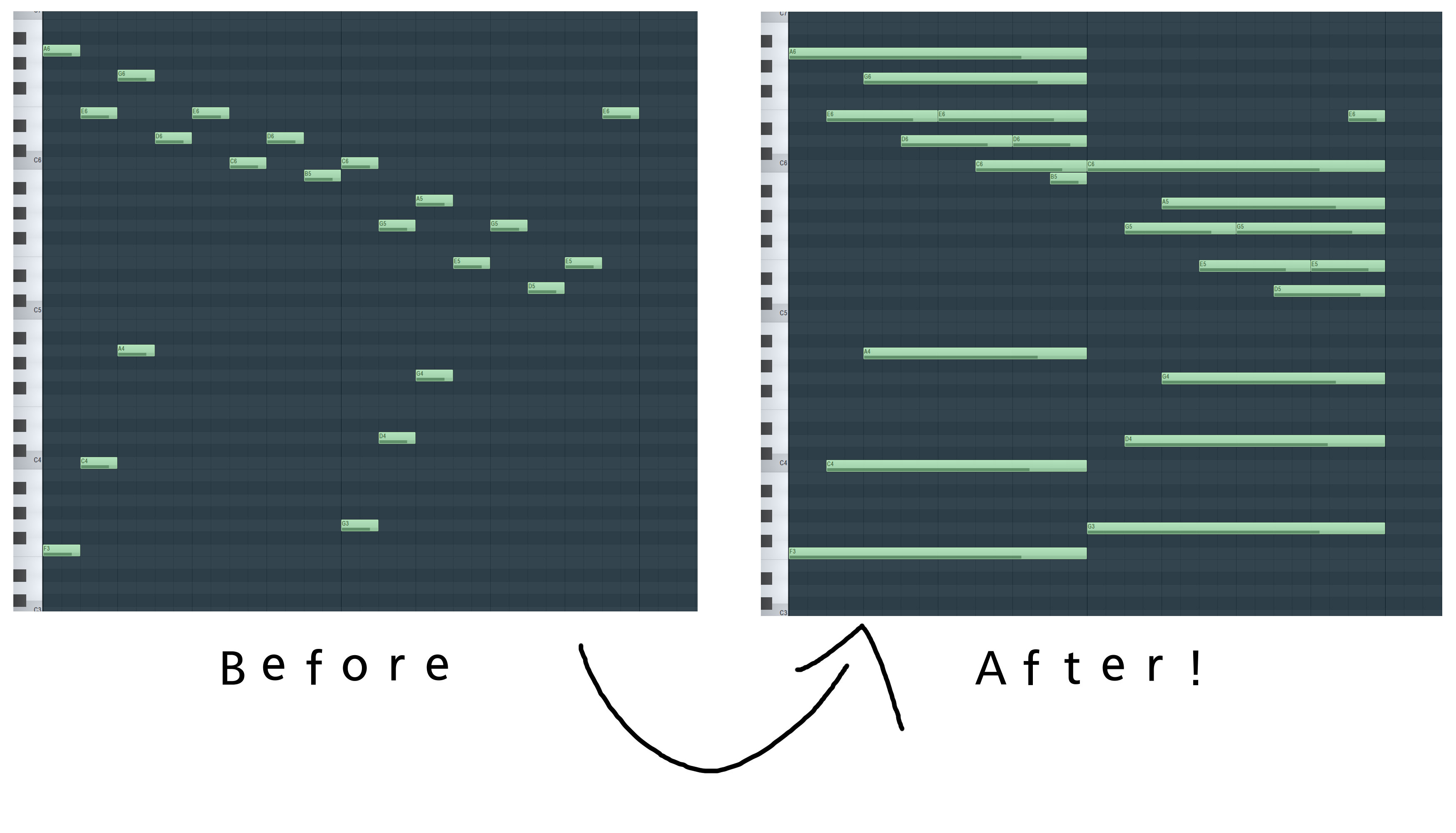 서스테인 페달이라도 썼다면 편하게 키음을 뽑을 생각은 하지 않는것이 좋을 것이다. 밑에처럼 일일이 노트를 하나하나 뽑는 정성을 보여주거나, 위 이미지와 같이 페달이 끝나는 마디까지 롱노트처럼 그냥 좍 드래그해라. 이건 서스테인 페달을 쓴 것은 아니라 사실상 사기 행각이지만, BMS를 실제 연주할때는 실제 피아노 연주자가 아닌 이상 체감 차이 안 난다.