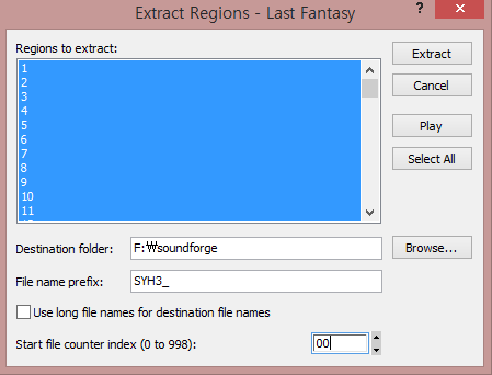 'Tools-Extract Region'을 누른다. 마커가 이미 찍혀있기 때문에 바로 뽑을 수 있다. 추출할 폴더를 선택, 그리고 File name prefix에 아까 뽑았던 미디 파일의 이름을 쓰고(_도 써놔라.) Start file counter index에 0을 하나 더 붙인 후 Extract를 눌러라. 주의할 점이 있는데, 반드시 _를 합해서 5글자 이하로 파일 이름을 정해야 한다. 그렇지 않으면 이름이 잘려서 BMS 구동기에서 인식이 안 된다.