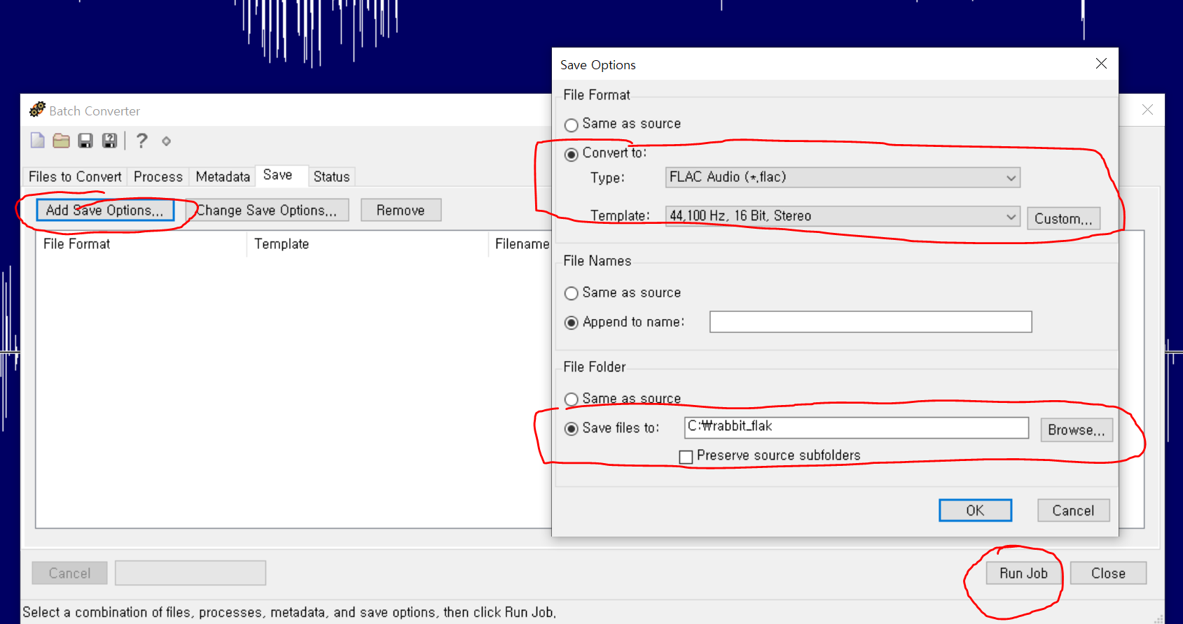 배치 컨버터를 띄운 뒤, Save 탭으로 들어가 위와 같이 설정을 하고 Run Job을 누르면 모든 음원 파일들이 beatoraja, Qwilight에서 완벽히 재생 가능한 FLAC으로 변환된다.