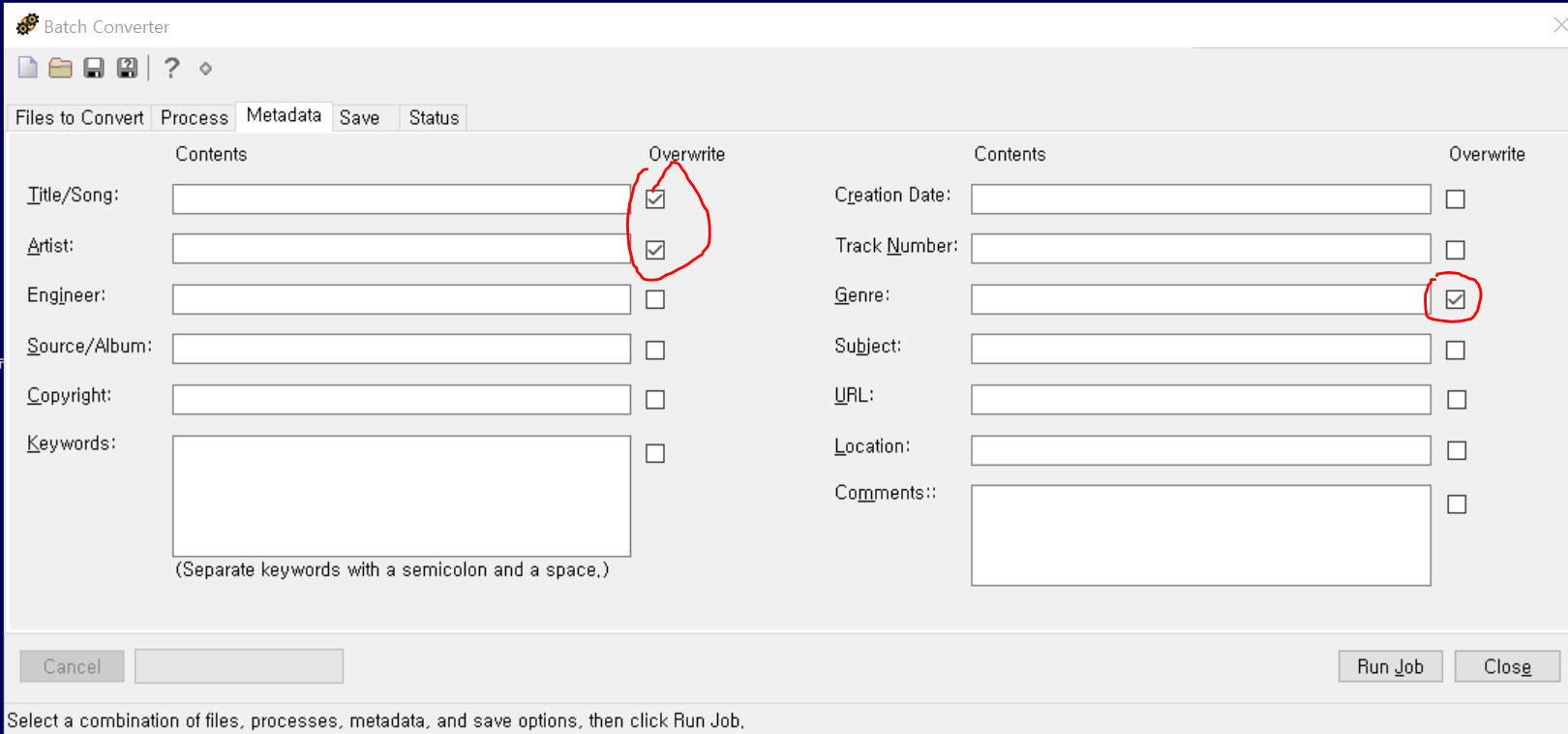 키음에 노래 제목이나 아티스트같은 오만 정보들을 미처 지우지 않고 뽑았을 때. WAV는 윈도우에서 메타데이터 수정이 불가능하다. Soundforge의 배치 컨버터에서 Metadata 항목으로 들어가 위와 같이 해당 항목에 체크하여 공란으로 냅두면 말끔히 제거된다.