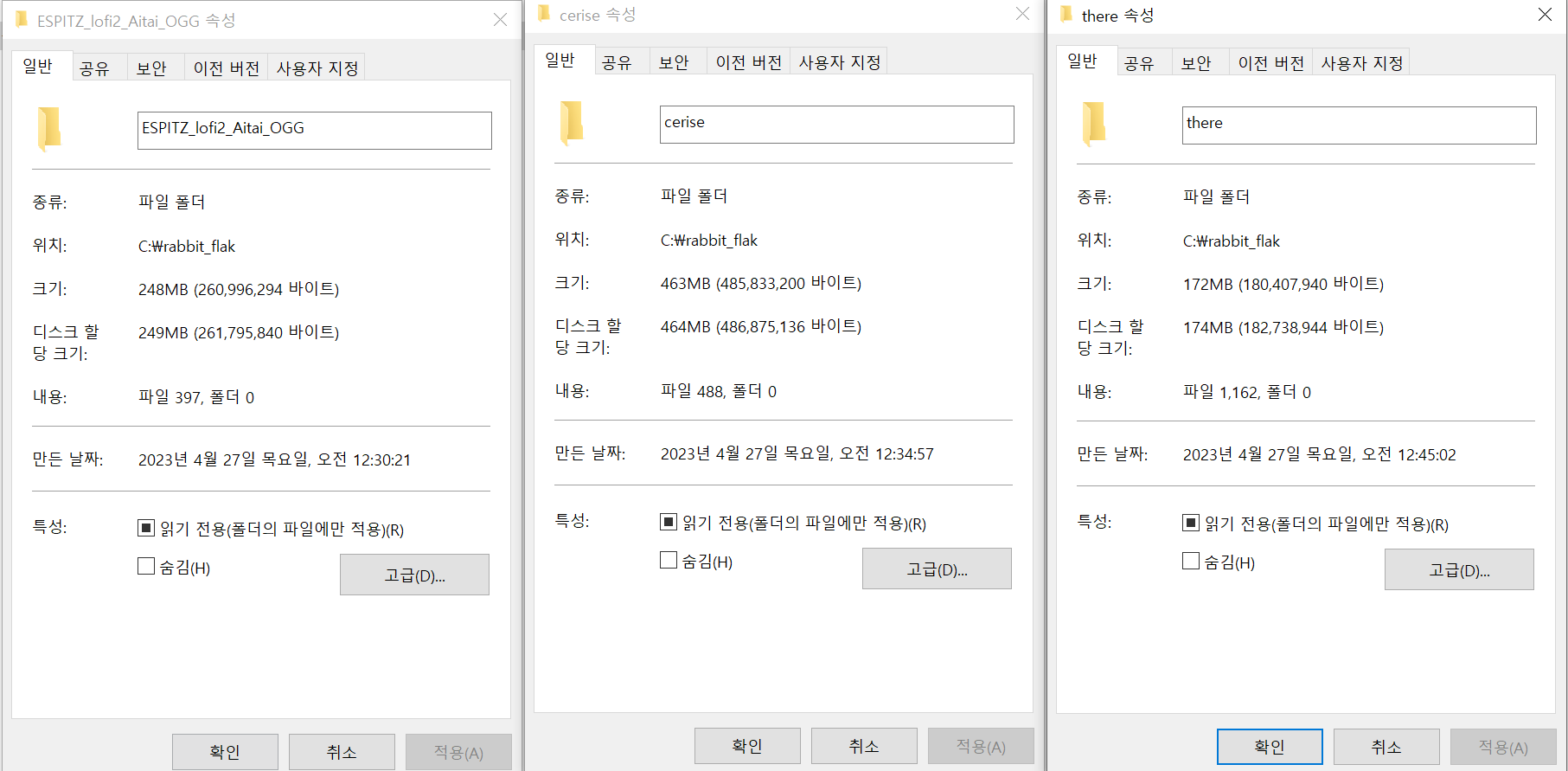 올해 PABAT!에 나온 노래들 몇개를 추려봤어요. 2개는 wav로 공식 배포하는 중이고, 하나는 ogg만 배포한 것을 16bit wav로 변환하여 보았어요. H264로 인코딩된 720p BGA의 용량은 보통 약 150MB 이상입니다. 음원보단 적은 용량입니다. 위의 BMS 음원 용량과 합체하게 되면 최소 400MB 이상은 찍는 무서운 수준이...되죠.